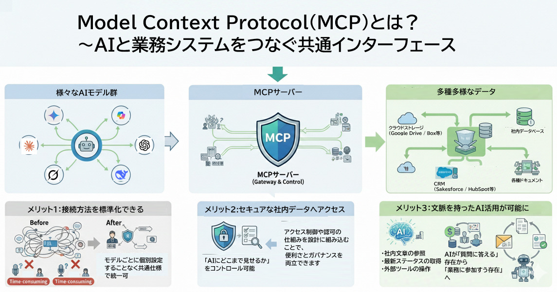 簡単に言えば、“AIと業務システムをつなぐ共通インターフェース” です。