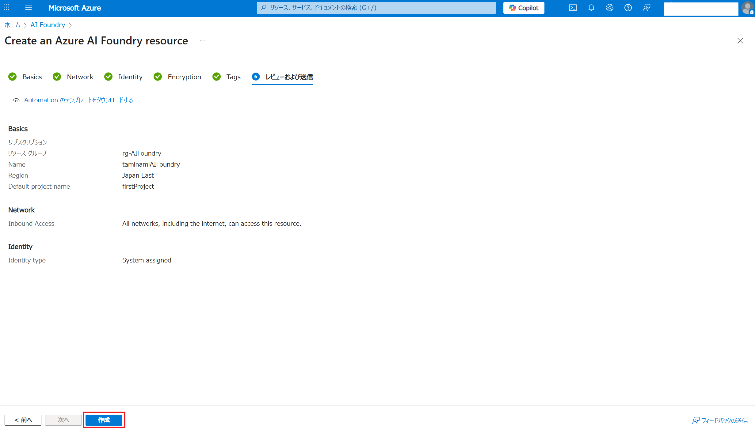 今回はAzure AI Foundryで試してみます。任意の名前でAzure AI Foundryをデプロイします。