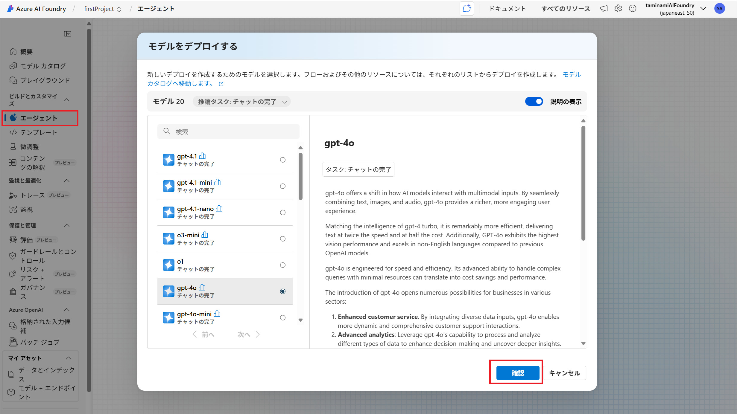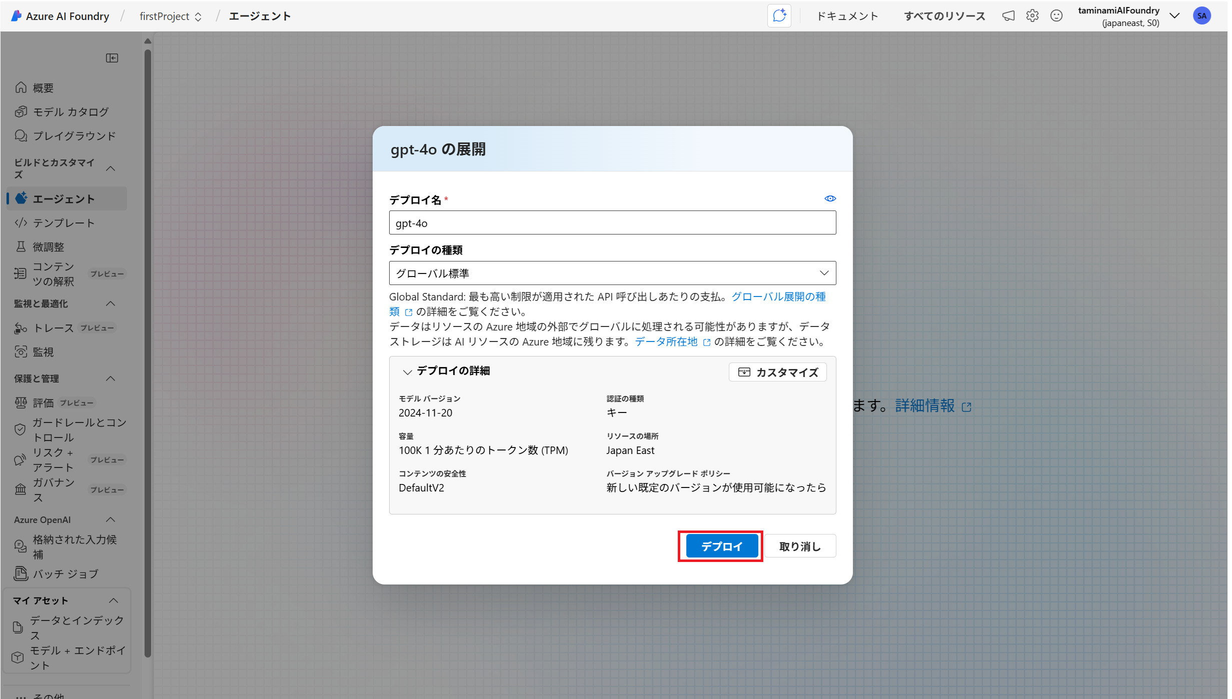 デプロイが完了後「AI Foundry Portal」にアクセスをし「エージェント」タブ上で任意のモデルをデプロイします。