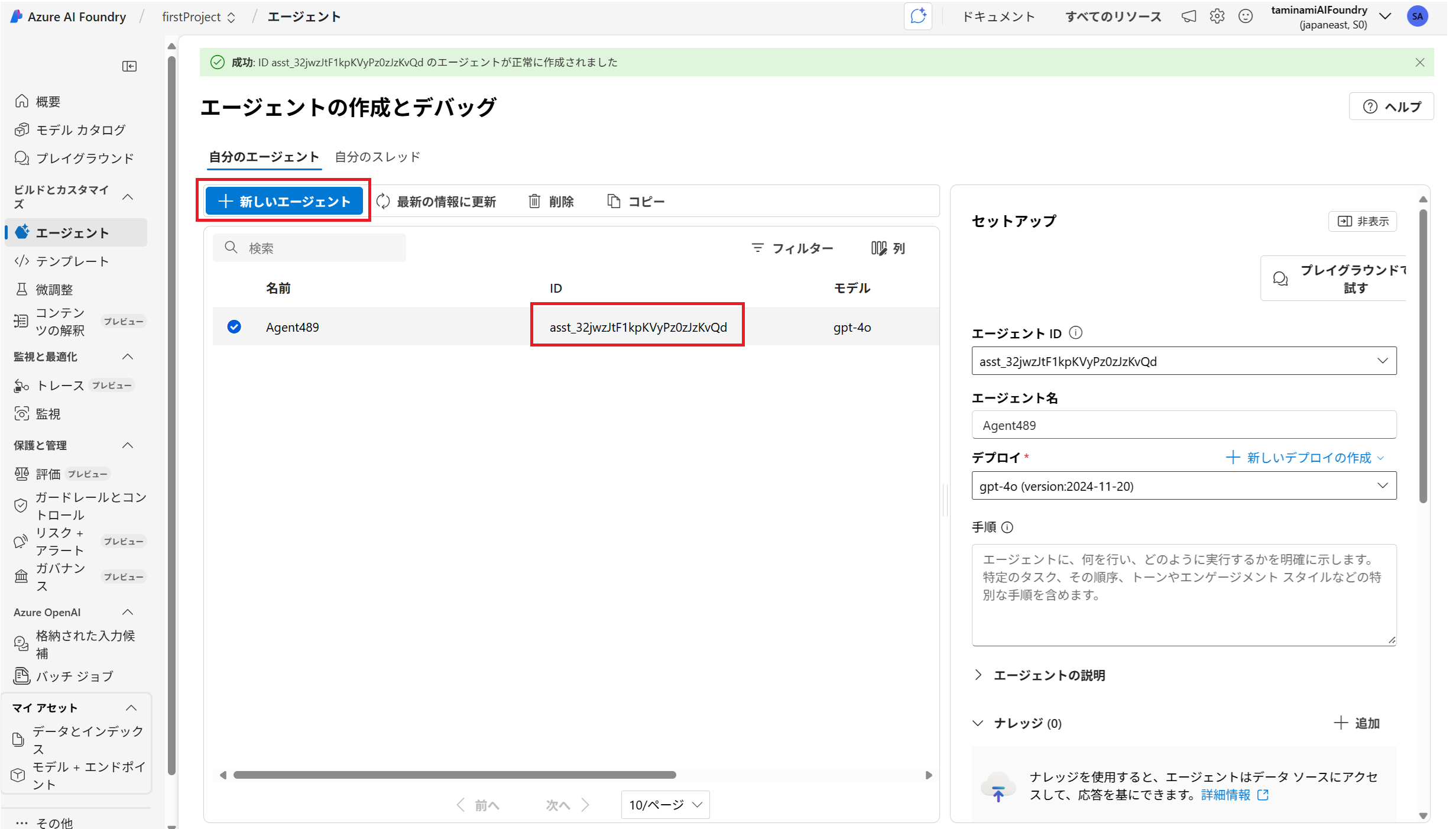 「+新しいエージェント」をクリックすると空のエージェントが一つ作成されIDが付与されます。