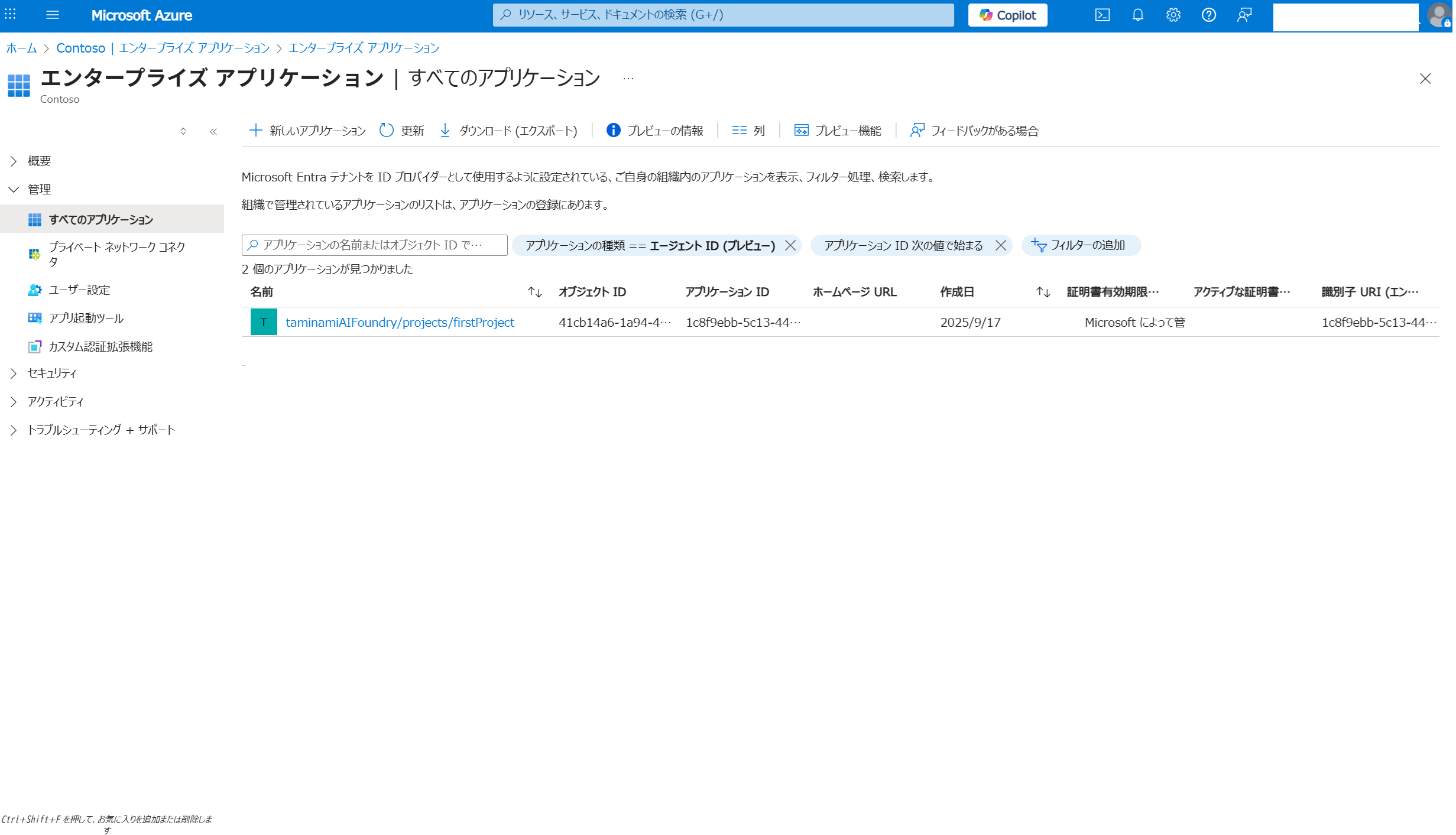 Azureポータルに戻り、Microsoft Entraの「エンタープライズアプリケーション」にてアプリケーションの種類を「エージェントID(プレビュー)」にすると作成されたプロジェクトを確認することができます。