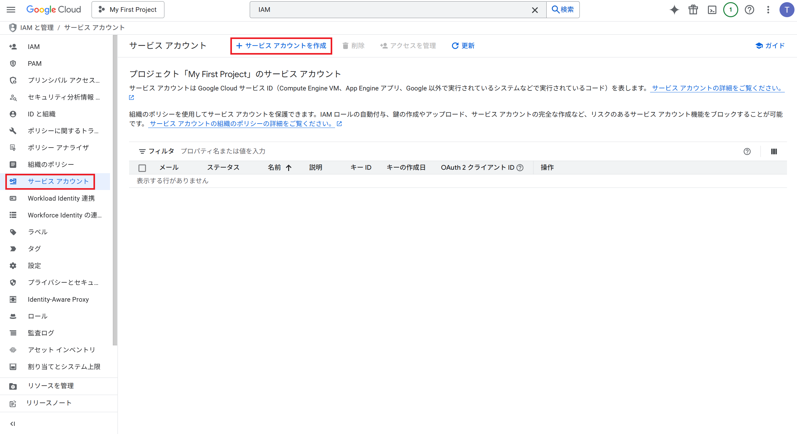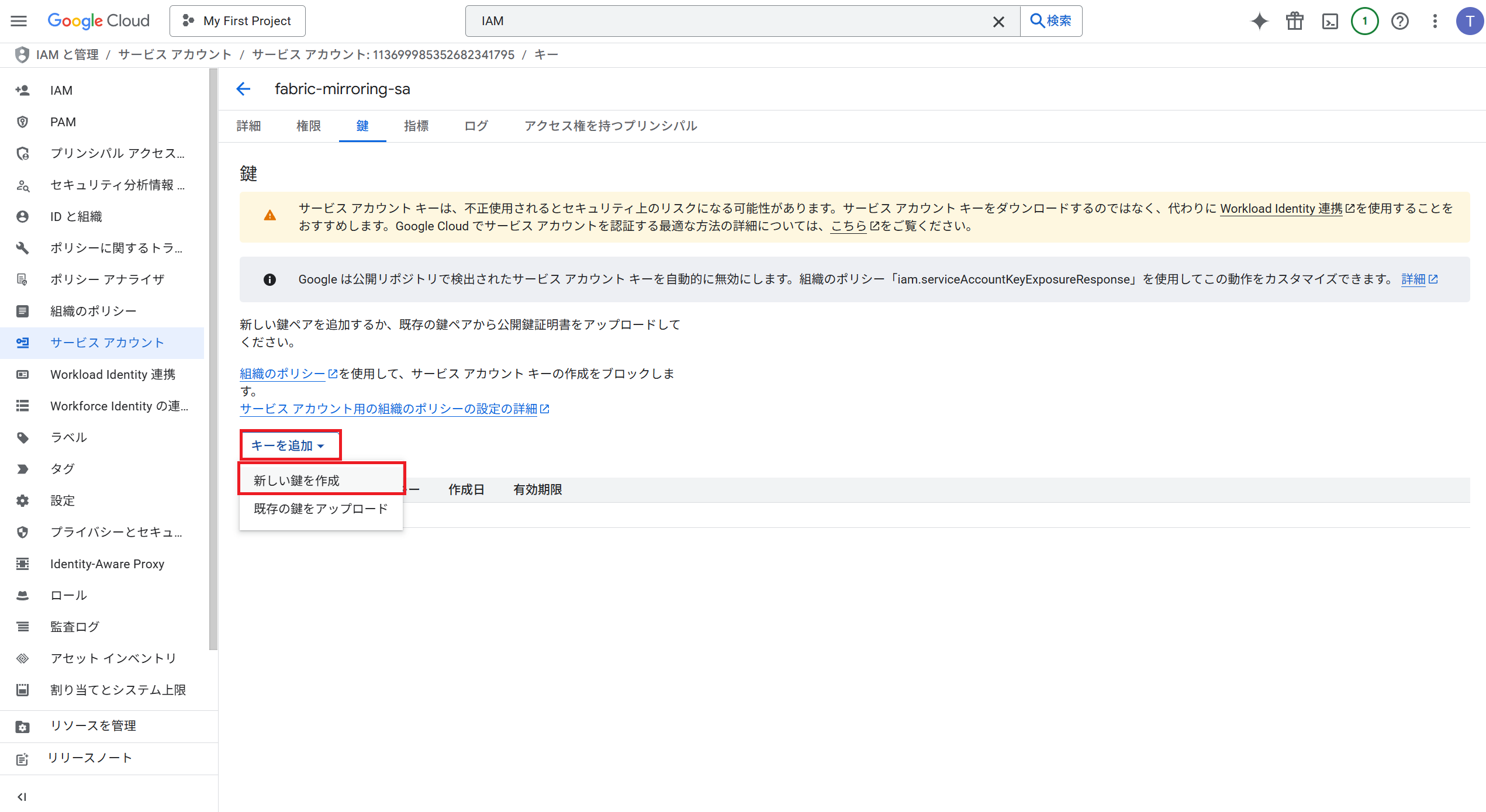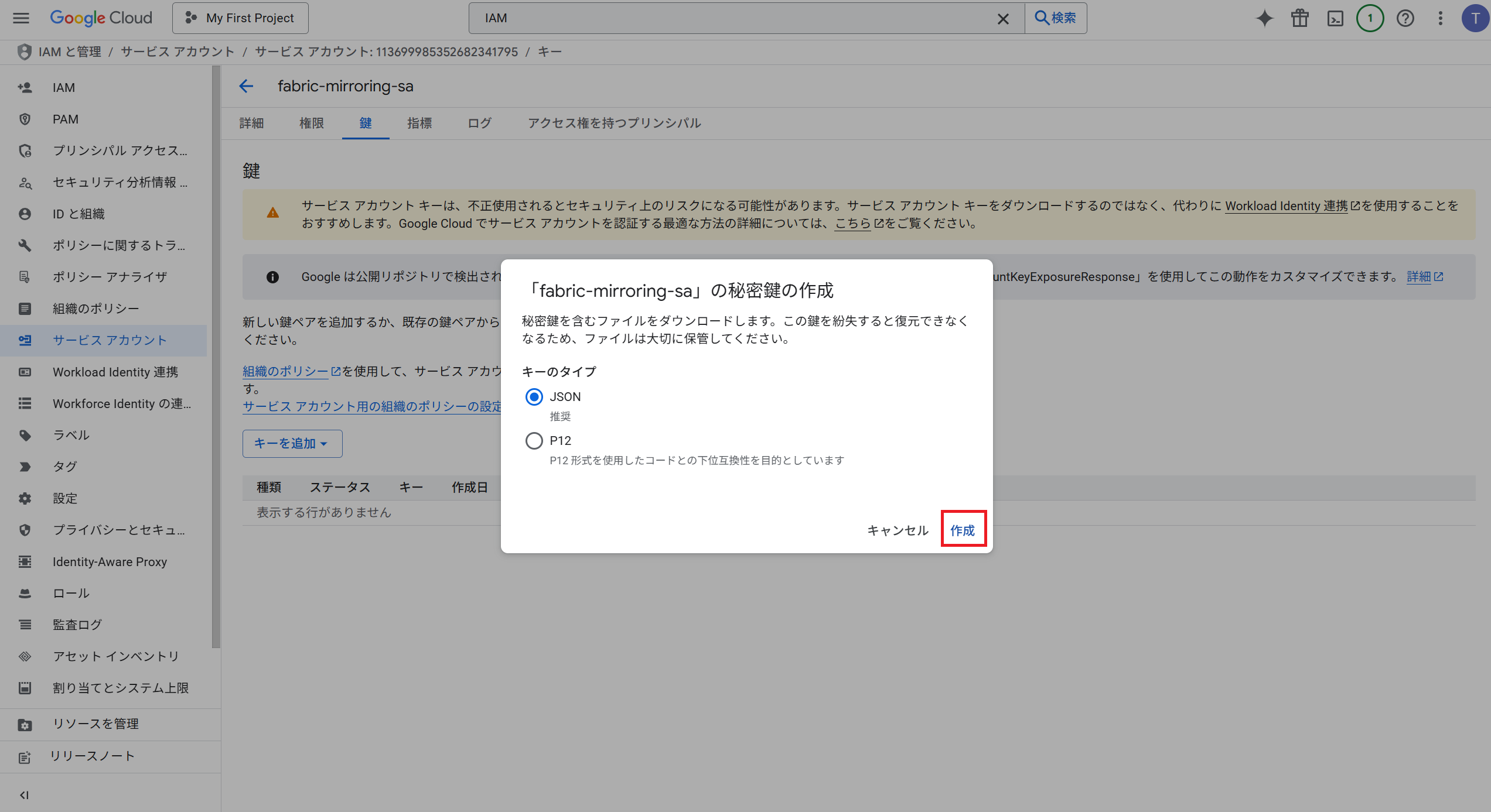 「JSON」を選択し「作成」します。(※この時、組織の適切な権限が付与されていないとキーがダウンロードできないのでご注意ください)