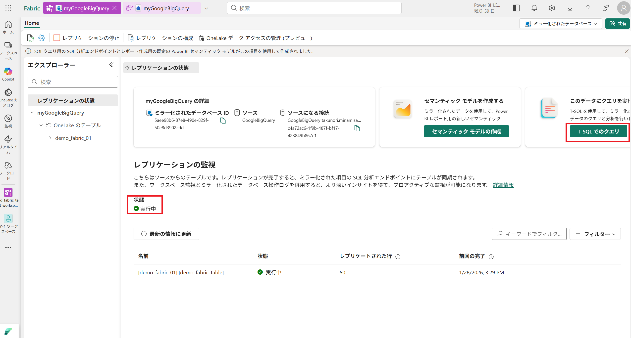 しばらくするとデータがレプリケーションされます。レプリケーションが完了したら「T-SQLでのクエリ」を実行してみましょう。