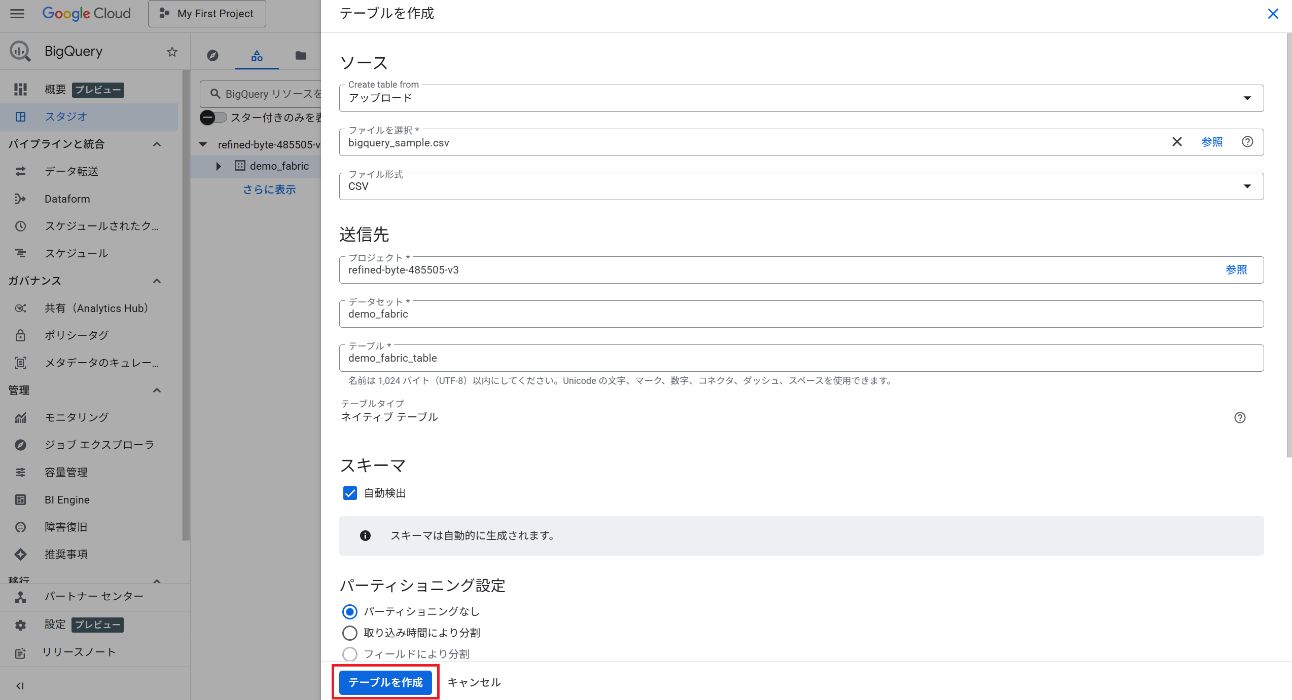 今回はサンプルデータ(csv)を用意してアップロードをし「テーブルを作成」します。