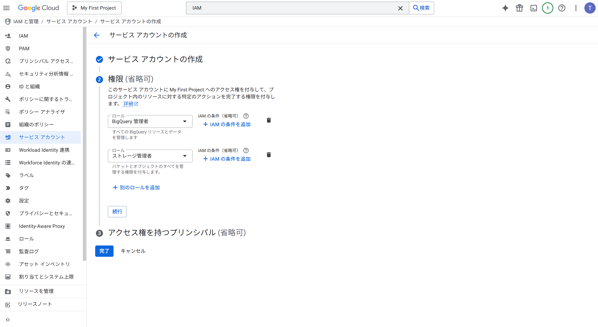 「BigQuery管理者」と「ストレージ管理者」権限を付与します。