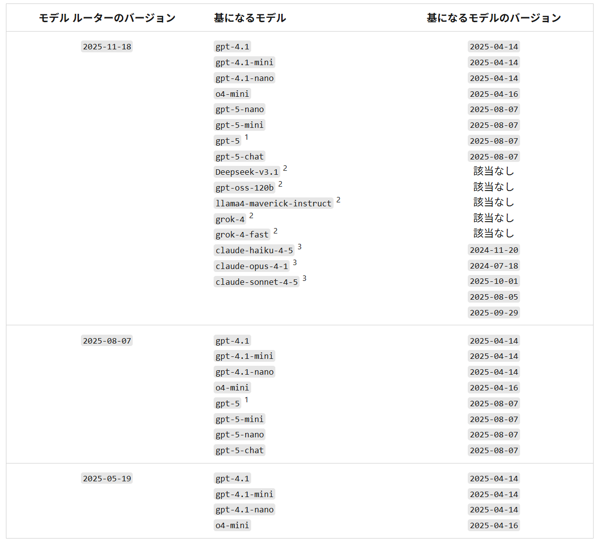 Microsoft Foundryのモデルルーターで使用できるモデルは、本記事作成時点で以下のようになっています。最新情報は必ず公式ドキュメントをご参照ください。