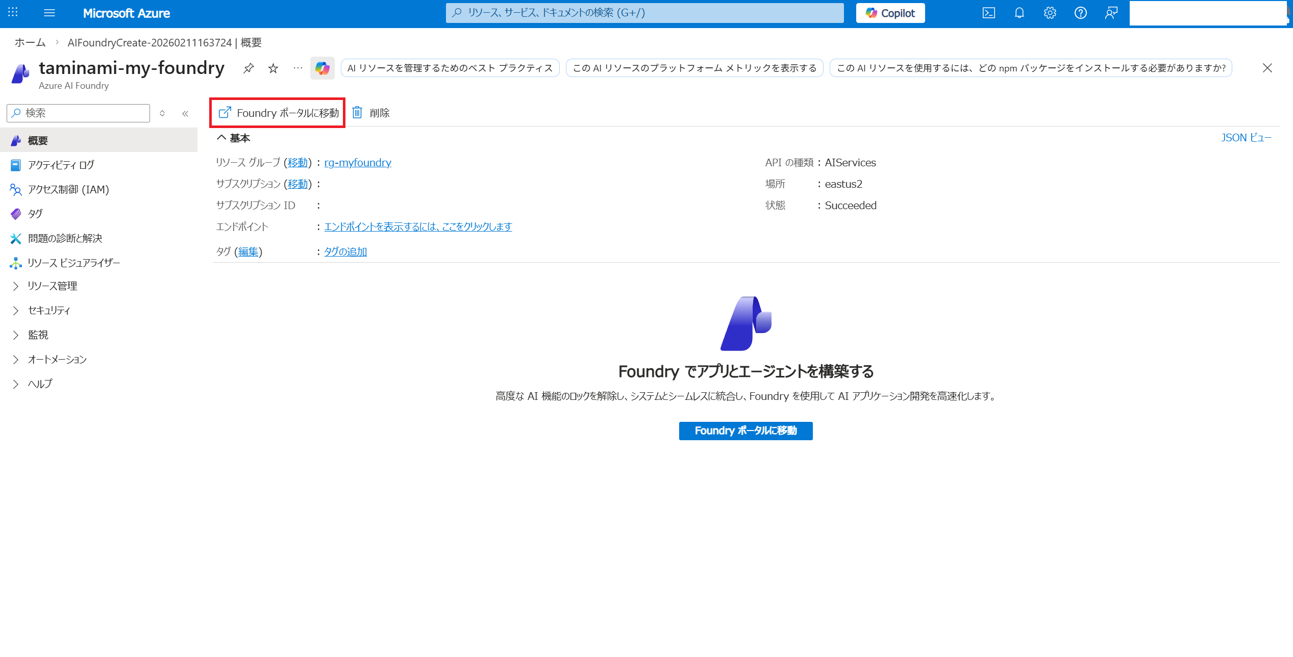 まずはAzureポータル上でMicrosoft Foundryをデプロイします。