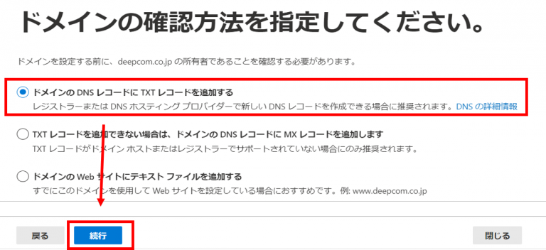③ ドメインの確認方法を「ドメインのDNSレコードにTXTレコードを追加する」を選択し、「続行」をクリックします。