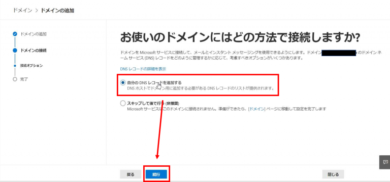⑤Microsoft365管理センターに戻り、「確認」>「その他のオプション」>「自分のDNSレコードを追加する」を選択し、「続行」をクリックしてください。