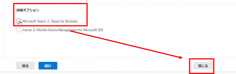⑥「詳細オプション」からMicrosoftTeamsとSkype for Businessにチェックを入れて「閉じる」を押せば完了です。