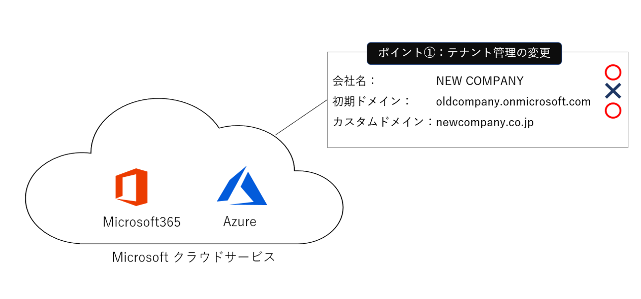 Microsoft365の再構築は労力とユーザー影響が大きい為、初期ドメインは古い会社のままで運営するのがベターだと思います。