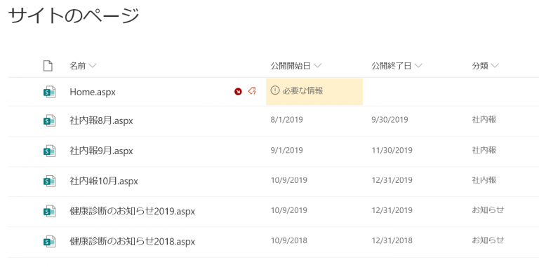下図のようにサイトのページに公開開始日、終了日、分類など任意に列を作成します。