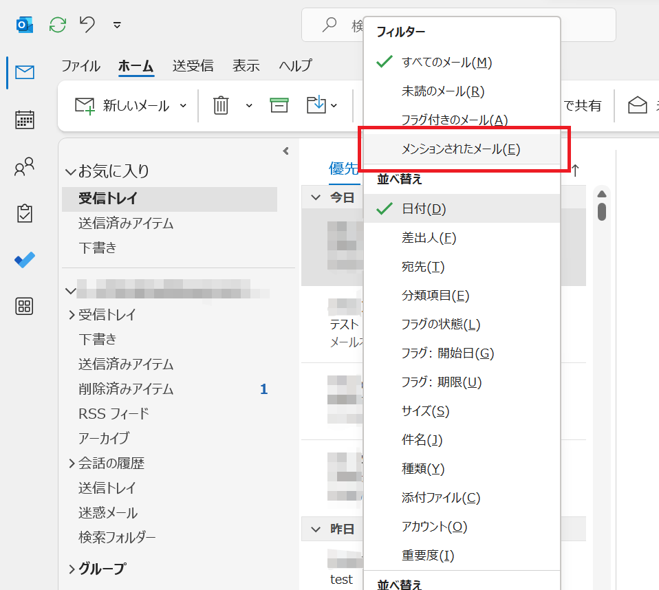 ①メール受信画面で右上のフィルターマークを選択します。 ②ドロップダウンから「自分をメンション」を選択します。 ③メンション付きのメールのみが表示されます。 ※デスクトップ版の場合は、フィルターから「メンションされたメール」を選択することで同じ機能が扱えるようになります。