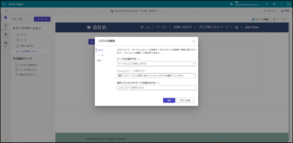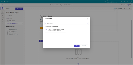 Power Pages ページ編集コンポーネント 追加リスト設定