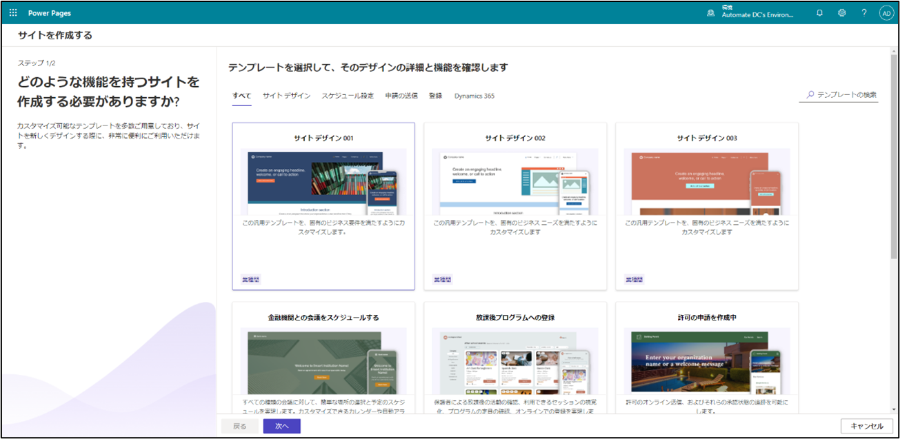 Power Pages テンプレート選択確認
