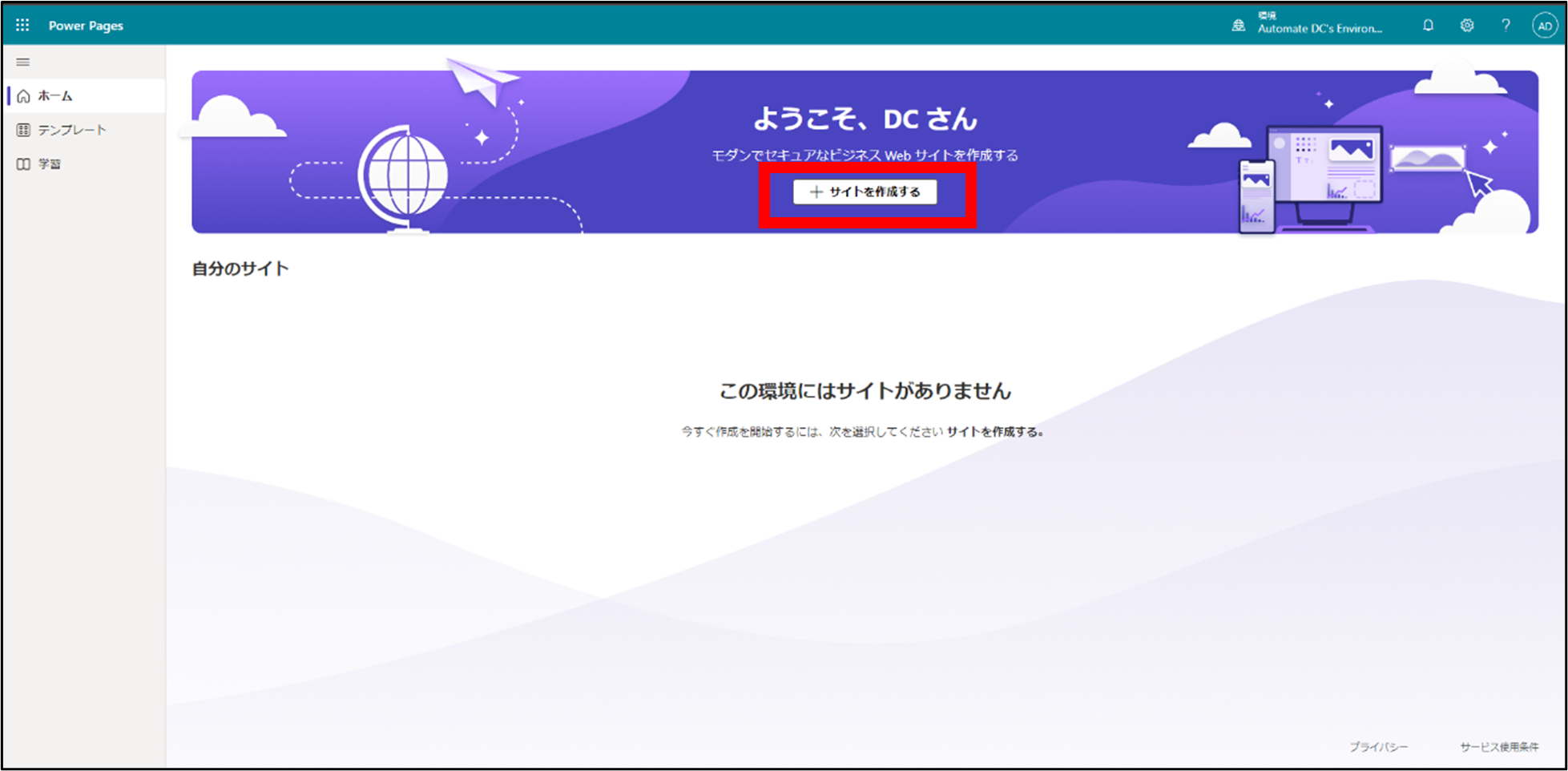 1.Power Pagesのホームから「サイトを作成する」をクリックします。