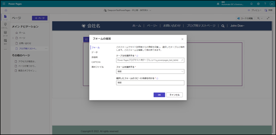 Power Pages ページ編集コンポーネント 追加フォーム設定