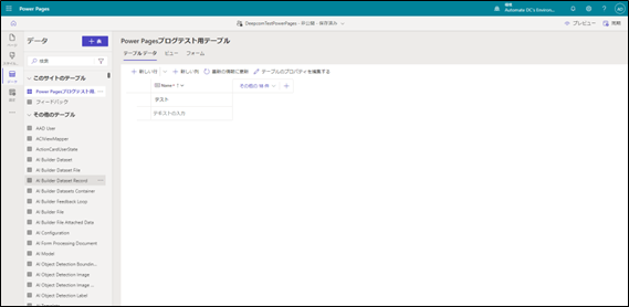 データ設定画面では、Power Pagesで利用するDataverseテーブルの作成や編集やデータの管理、