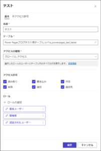 アクセス許可の名前、アクセス許可をするテーブル、