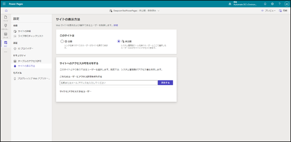 Power Pages Webサイト設定 サイトの表示方法編集