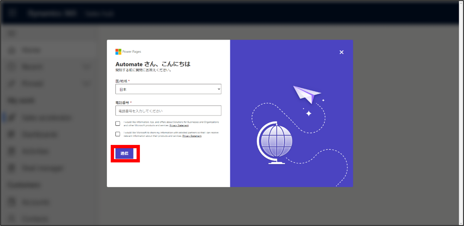 3.国/地域と電話番号を入力して「送信」をクリックします。