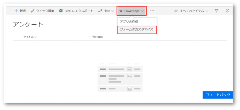 作成したアンケート用リストを開き、リボンの【Power Apps】【フォームのカスタマイズ】の順番でクリックします。【Power Apps】が表示されていない場合は同じくリボンの【・・・】をクリックすると表示されます。