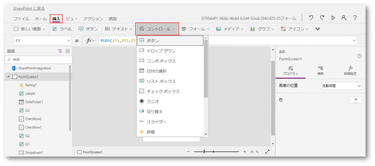 コントロールメニュー(プルダウン)から追加したいコントールをクリックするとフォームに追加されます。