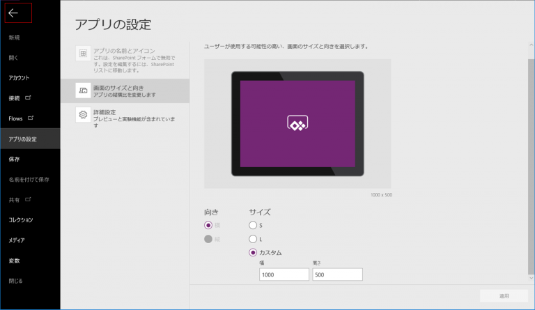 【画面のサイズと向き】画面が表示されます。サイズは【S】【L】の2種類ですが、【カスタム】を選択すると任意のサイズに調整することができます。