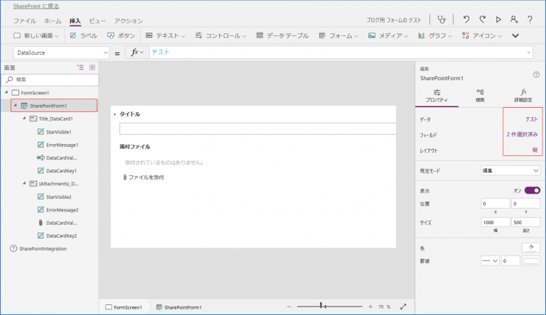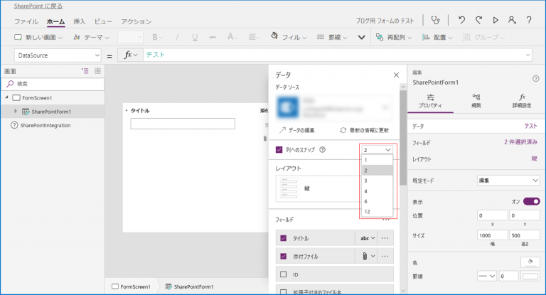フォームの編集画面左の【SharePointForm1】をクリックし、画面右の【プロパティ】から【データ】【フィールド】【レイアウト】のいずれかの設定値をクリックします。
