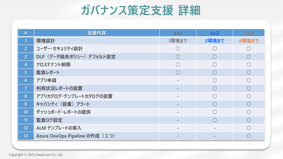 Power Platform導入時、環境の構築や展開、セキュリティの定義や運用方針に重きを置いたサービスです。