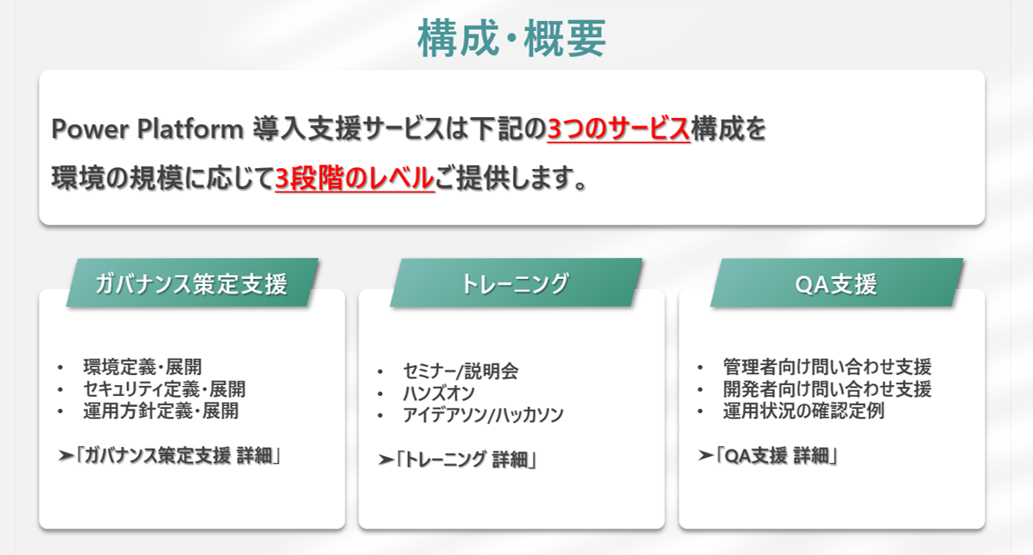 Power Platform 導入支援サービスは、下記の3つのサービスに焦点を当てています。