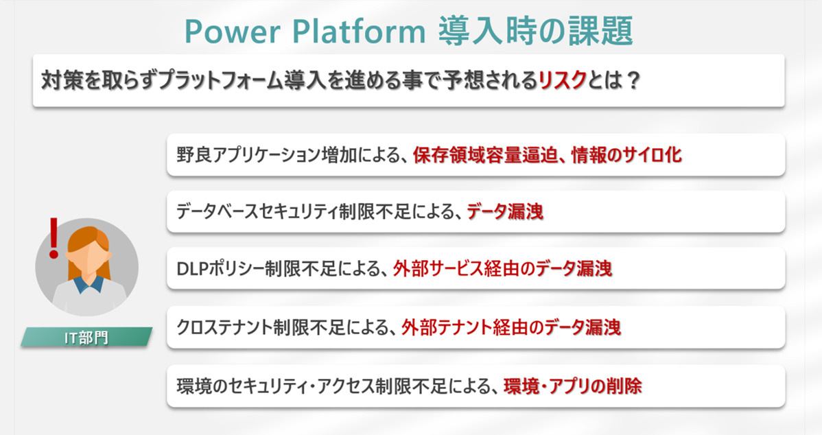 昨今、ローコード・ノーコード開発が注目される中、 Microsoftで提供されている「Power Platform」の名前を目にする方が増えているかと思います。 しかし、新プラットフォームを導入する敷居の高さやガバナンス&セキュリティ面の懸念など課題から一歩踏み出せない企業が多いのではないでしょうか。 ローコードプラットフォームの長所である自由度を下げた開発は、セキュリティや情報のサイロ化を引き起こすリスクの増加に繋がります。