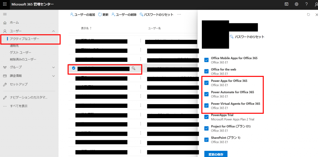 ②使用を許可したいユーザーを選択後、「Power Apps for Office365」をチェックし、「保存」を行う
