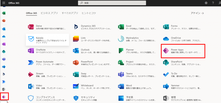 ページ中央もしくは左メニューからPower Appsのアイコンをクリックしてください。