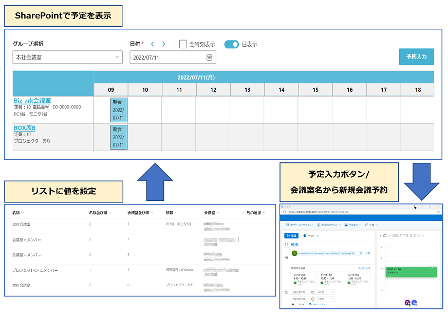 SharePoint上で予定の一覧表示や、会議予定を新規作成することができます。※新規作成された予定はOutlook側からも確認可能。