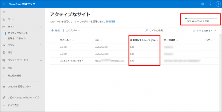 Teamsの容量は「SharePoint 管理センター」からテナント全体やサイト毎の容量を簡単に確認することができます。
