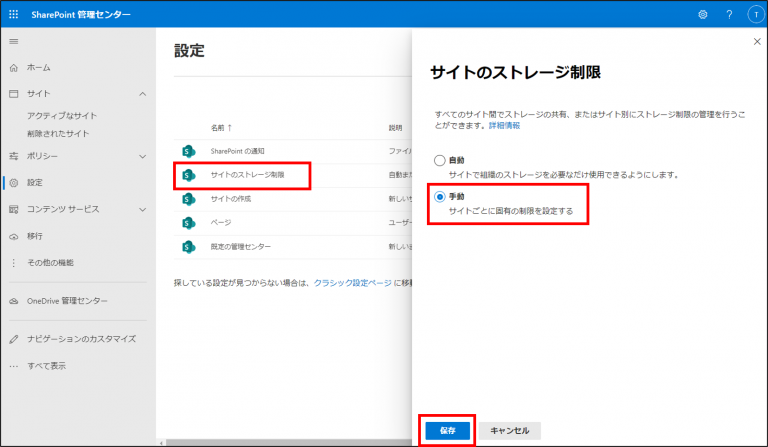 同じ「SharePoint 管理センター」内の [設定」-[サイトのストレージ制限サイトのストレージ制限] でストレージ制限の管理方法を [手動]に設定します。