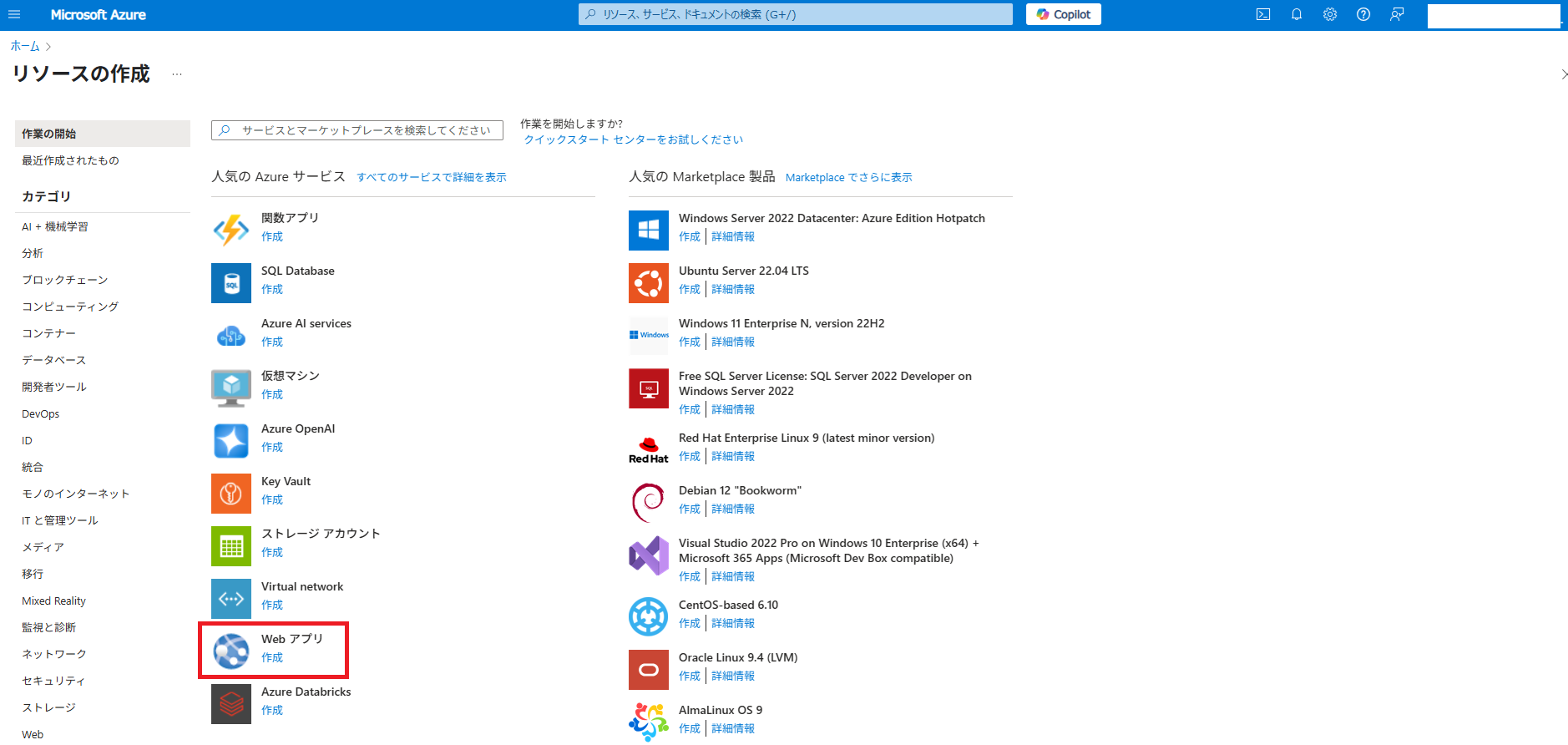 Webアプリを「作成」します。(※もし画面に表示されていない場合には、検索欄で検索をしてみてください)