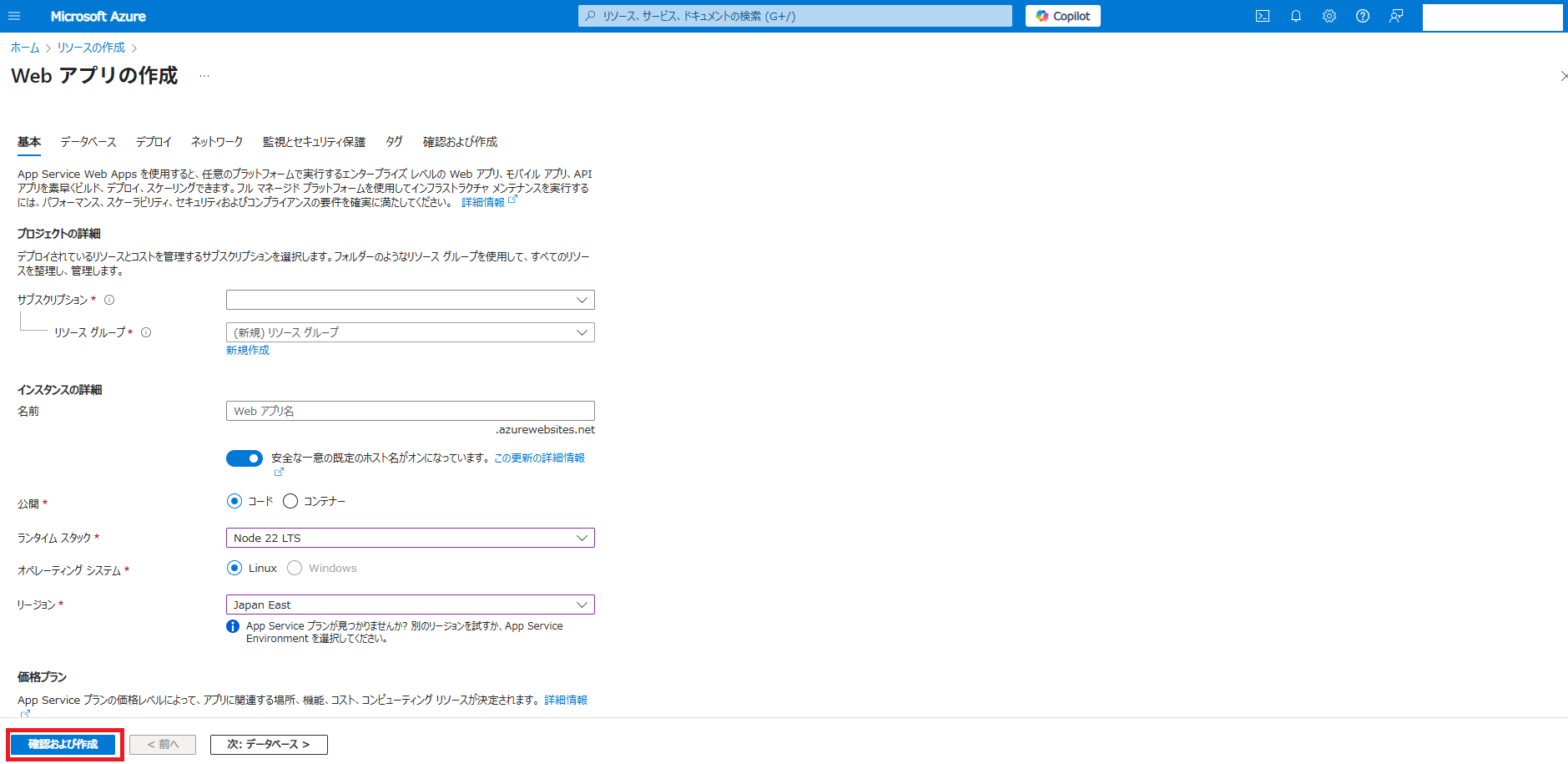 各種入力必須事項を入力します。データベースやネットワークなども追加で細かな設定をしたい場合には各タブで設定をすることができますが、今回は検証のためそのまま「確認および作成」をクリックします。