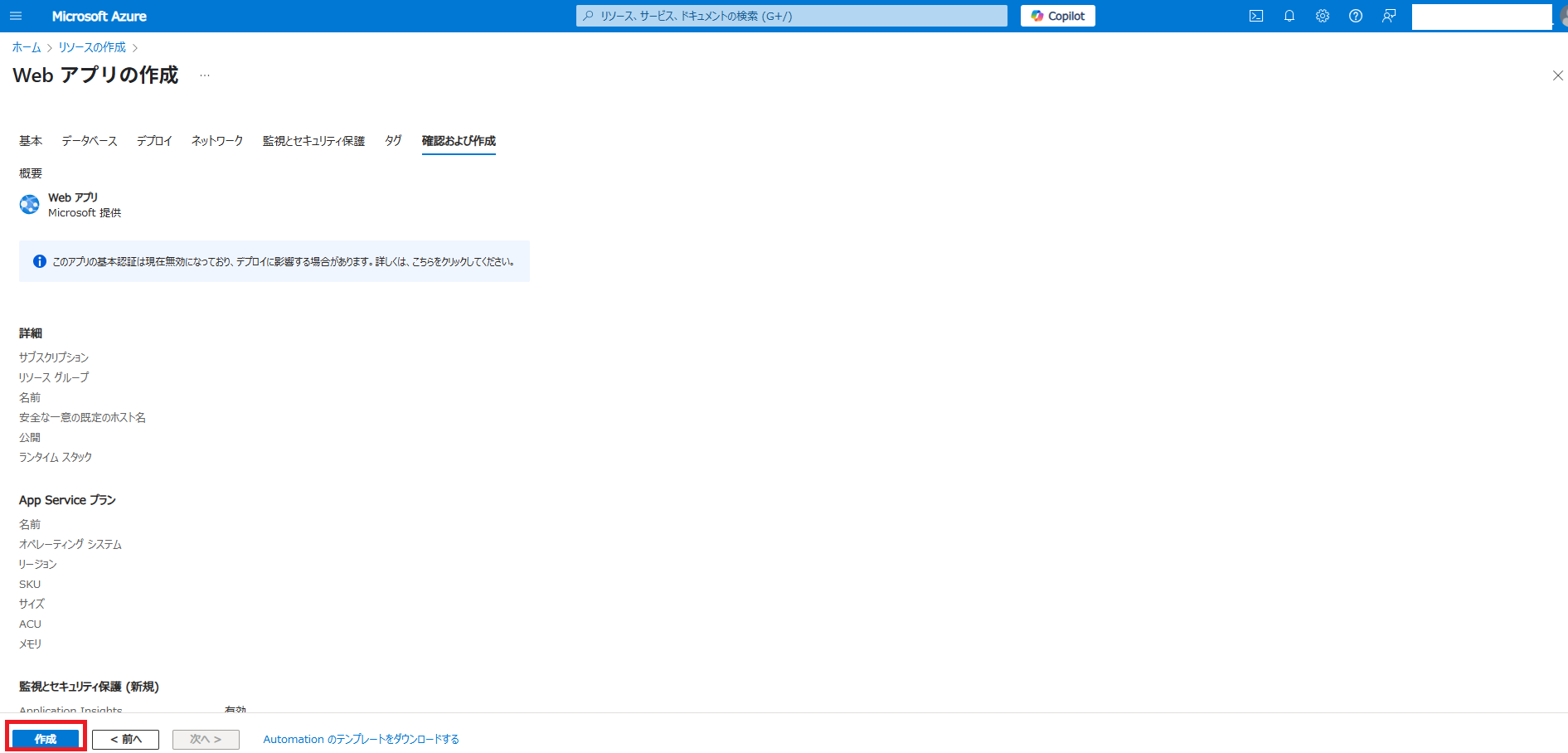 内容を確認し、「作成」をクリックするとデプロイが開始されます。何も問題がなければ1分も経たないうちにデプロイが完了します。