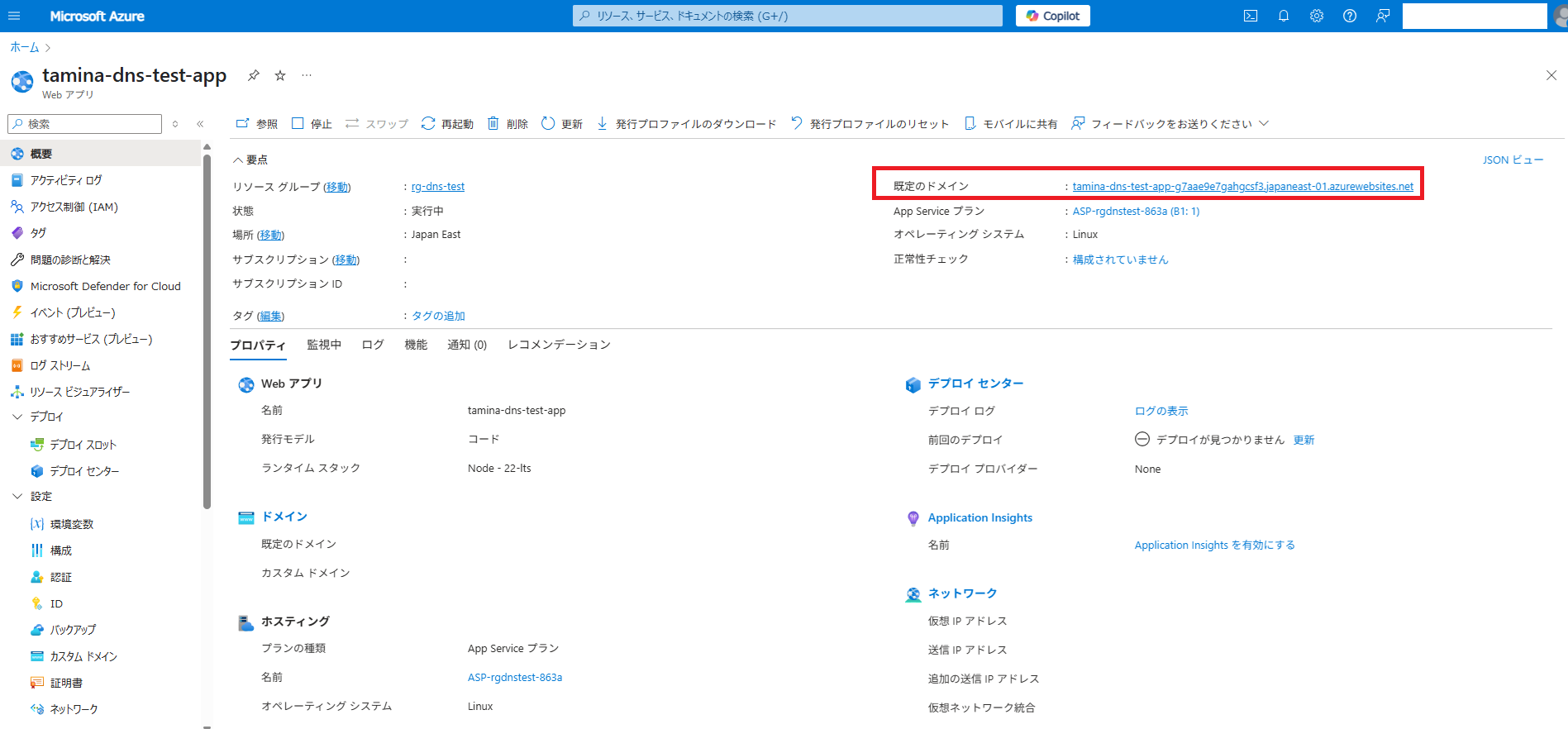 デプロイが完了するとAzure App Serviceの操作画面を確認できます。設定した初期のリソース名でWebサイトのURLが発行されています。