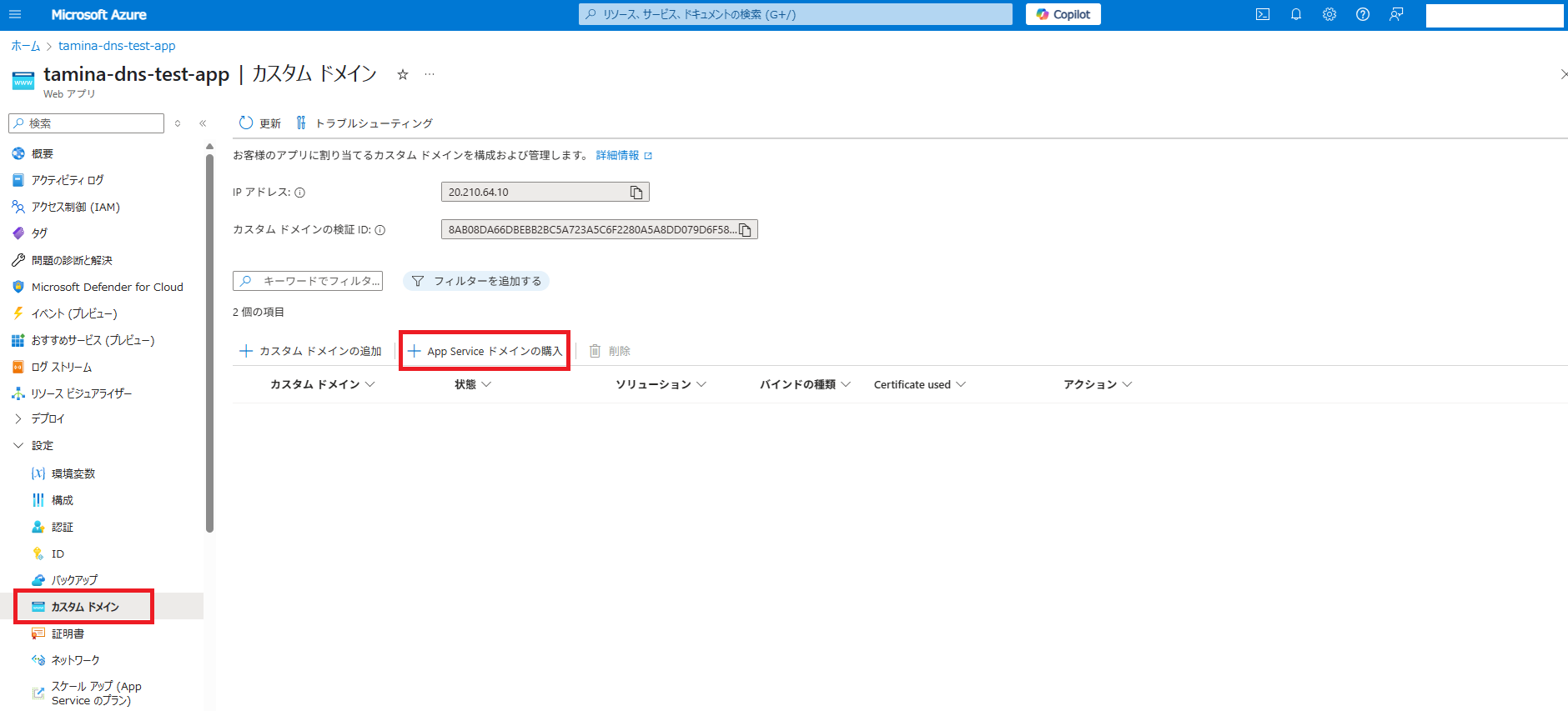 App Serviceドメインを使ったカスタムドメインの購入と設定