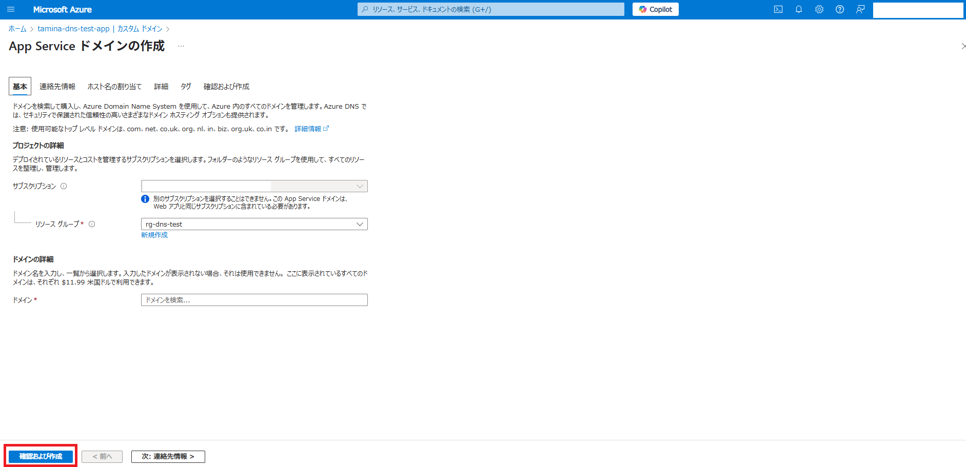 「ドメイン」の欄に購入したい独自ドメイン名を入力します。入力した文字列が一意であることが確認されると「確認および作成」をすることができます。