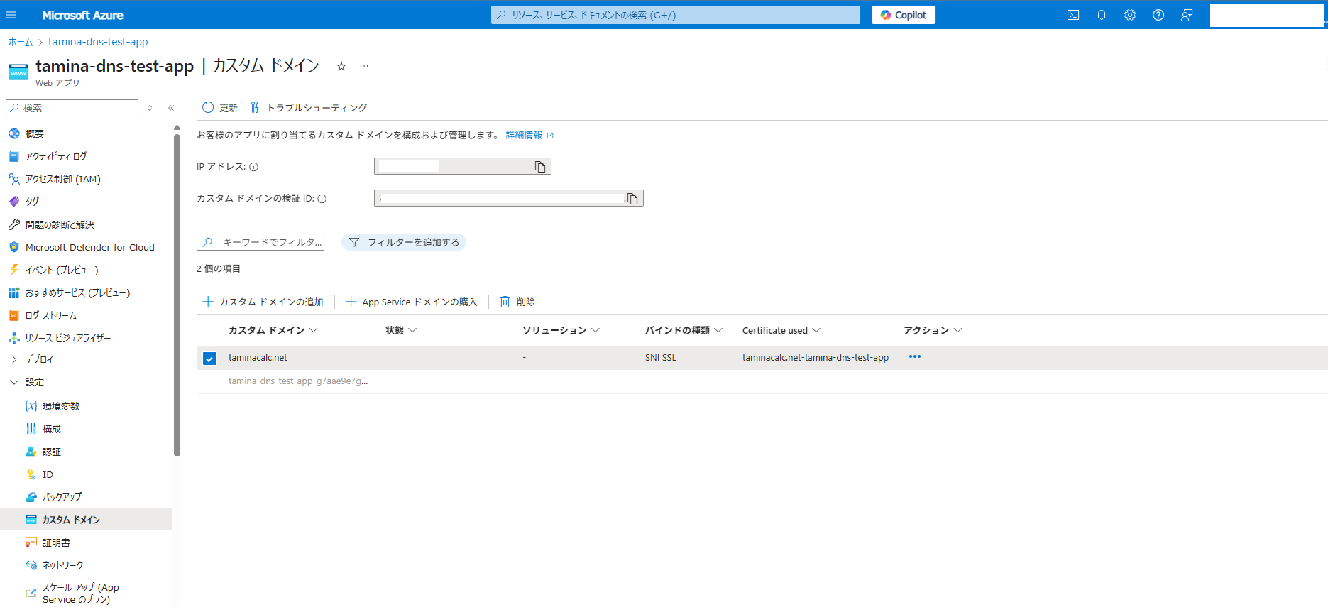 少し時間はかかりますが、しばらくするとドメインの購入が完了しApp Service上に購入したドメインが表示されます。購入した独自ドメインで作成したWebサーバーにアクセスできることも確認できます。