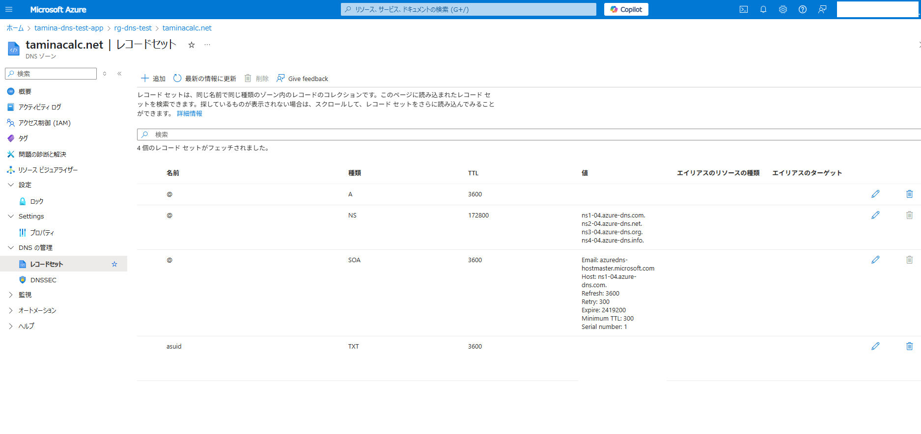 内部では自動的にAzure DNSと呼ばれるマネージドサービスがデプロイされており、先ほど購入した独自ドメインをマネージドのDNSサーバーとしてホストしていることが確認できます。AレコードやCNAMEまで自動的に設定してくれるのはとても便利ですね!